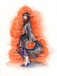 Leider ist mir das Gesicht diesmal nicht so gelungen und der Hintergrund sieht ungewollt wie eine Explosion aus (Was aber eigentlich trotzdem gut zur Figur passt! :D), aber ich bin recht stolz auf die Coloration des Mantels. Genauso wollte ich Schwarz immer schattiert haben und es ist mir am Computer nie gelungen! Aquarell ist so toll!!!