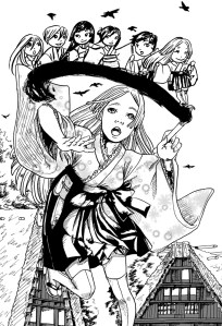 Hab versucht die Ränder ein bisschen freizuhalten. Bei der Tintenzeichnung habe ich sowohl einen G-Pen und Saji-Pen alsauch einen chinesischen Kalligrafiepinsel benutzt. Überarbeitet ist es dann mit Manga Studio. Als Referenz für den Hintergrund habe ich ein paar Fotos von einem historischen japanischen Dorf verwendet.