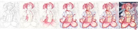 Weiter geht’s mit den Puella-Magi-STA-Karten! Diesmal gibt es eine Madoka. Bitte schaut sie ich wieder in voller Größe an. Pink ist eigentlich eine Farbe, die ich sehr selten ungemischt nutze. Diese Karte ist also eine Farbprimiere für mich! 😀