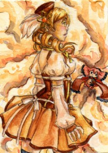Karte für die Madoka-STA auf kakao-karten.de. Ich habe versucht, als Hintergrund eine Wolkenspirale zu malen. Die Sepia-Töne zu benutzen war eine schöne Abwechslung! 🙂