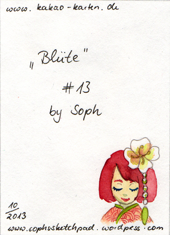 Das nächste Bild ist wieder eine KAKAO-Karte. Diese habe ich für eine Verlosung auf meiner Facebook-Seite gemalt. Ich habe versucht, diesmal wieder etwas Buntes zu malen. Den Grünton, den ich für die Steine und den Kimono verwendet habe, mag ich sehr. Auch die Farbkombi zwischen dem rötlichen Rosa (eigentlich sollte es eine Mischung aus Weinrot bis Kastanienbraun werden) und dem Grün hab ich sehr gern.