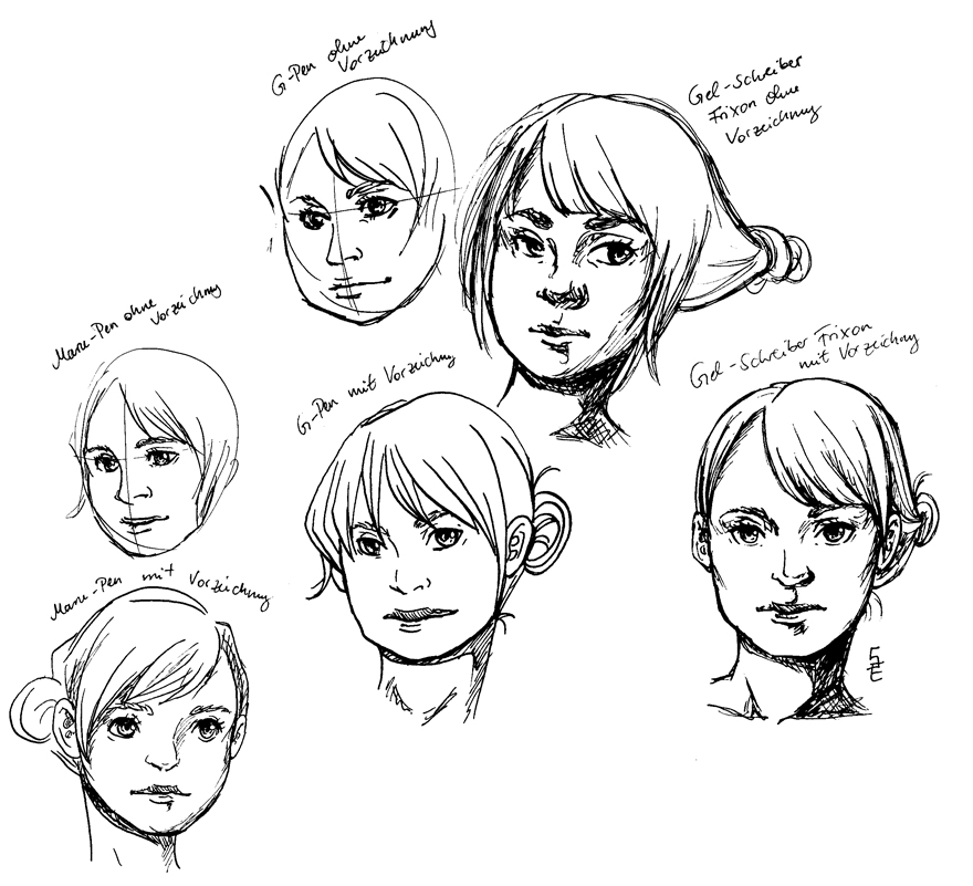 Mit dem G-Pen habe ich so meine Probleme. Ich habe das Gefühl extrem vorsichtig zeichnen zu müssen, damit ich nicht abrutsche, verkrampfe beim Zeichnen und bin von dem Ergebnis immer enttäuscht. Also habe ich eine Handhabungsgegenüberstellung gemacht. Auf dem Bild seht ihr Gesichter, die ich mit G-Pen, Maru-Pen / Röhrchenfeder und dem Gelstift (einmal jeweils mit und ohne Bleistiftvorzeichnung) gezeichnet habe.