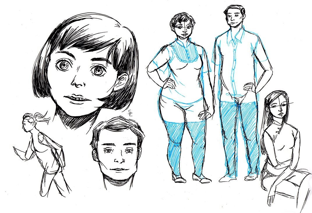 Meist zeichne ich zuerst die Körperform der Figur und lege dann die Kleidung drüber. Manchmal gefällt mir die Form so sehr, dass ich die Figur gar nicht mehr anziehen und lieber nur die Wirkung der Form behalten will. Hier habe ich die Kleidung einfach mit einer anderen Farbe drübergelegt, um beides zu haben.