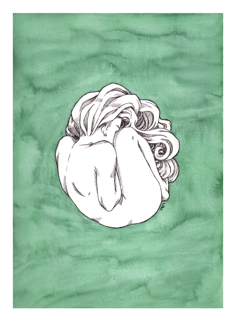 My heart bleeds when I look at this painting. The concept was to try out the technique Danica Sills discusses in her video on flat washes with watercolor. Since I wanted to try out a mixed media piece for a while now, it seemed like an interesting project. I actually practiced it separately before I used it on the project. But in the middle I repainted a brighter spot on the still wet paper, leaving a streak on the color. I painted it over and over; even glazed it a second time after the paint was dry in a desperate effort to save it. But I failed. I have to admit that the end result is not too bad but it is not what I had in mind for this. I don’t know whether I used too much water (probably; the paper was creasing a little), or the brush size or form (round brush, which was probably a mistake) was not correct. Or it was just my impatience. If you have any tips it would be lovely if you could tell me in the comments!
