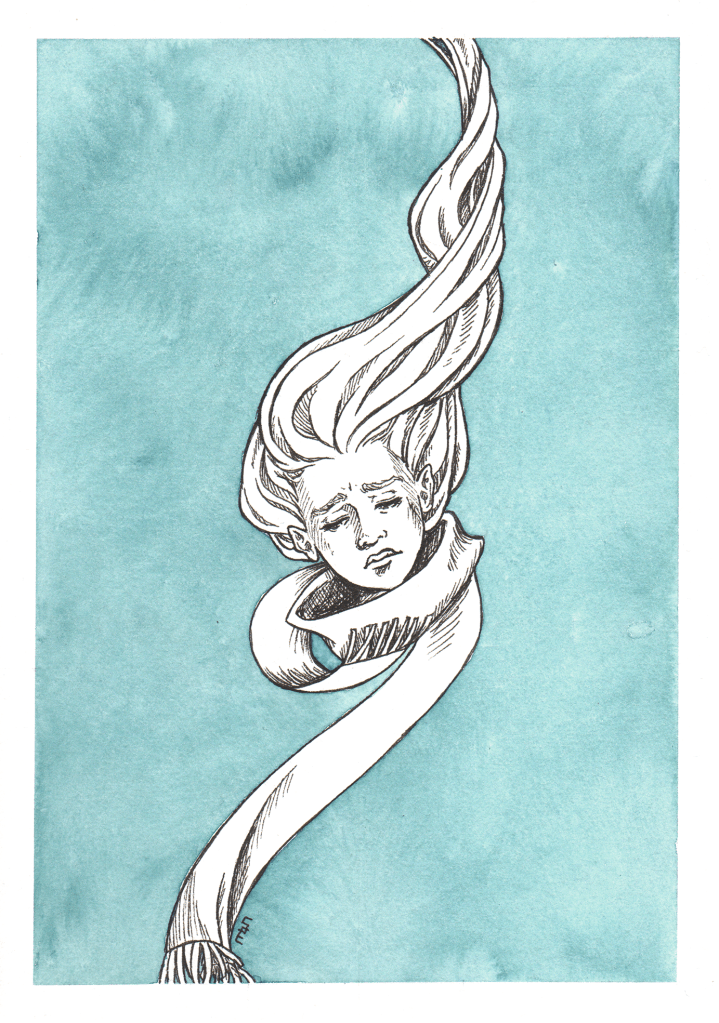 Vor ein paar Wochen habe ich ein Bild aus einer Kombination von Tinte und Aquarell gemalt, bei dem ich sehr unzufrieden darüber war, wie fleckig die Farbe getrocknet ist. Natürlich musste ich das Ganze noch mal versuchen und dieses Mal ist es mir viel besser gelungen. Es scheint, ein flacher Pinsel ist viel besser geeignet für sowas (Wär hätte das gedacht?) und ich habe versucht schneller zu arbeiten, damit die Farbe nicht trocknet. Ich mag, dass es der Figur ein aufgewühltes und gleichzeitig ruhiges Aussehen gibt. Da frage ich mich, wie so ein Bild wohl aussieht, wenn ich wärmere Farben verwende.