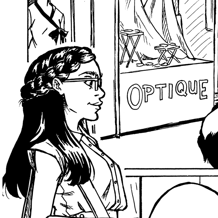Es geht nun so richtig los: Die erste Seite des Mini-Comics „Brille“ ist da! Bin ich froh, dass ich sie bis heute fertig bekommen habe! Schon jetzt habe ich das Gefühl beim Zeichnen viel gelernt zu haben. Zum Beispiel werde ich in Zukunft noch mal mit der Dicke der Panel- und Sprechblasenlinien herumspielen, damit sich die Zeichnungen besser davon abheben. Die Hintergründe… waren wie immer eine Herausforderung. Wenn ich sie zeichnen muss, ist meistens der Punkt erreicht, an dem ich die Geduld verliere. Das ist aber vermutlich auch nur Übungssache.