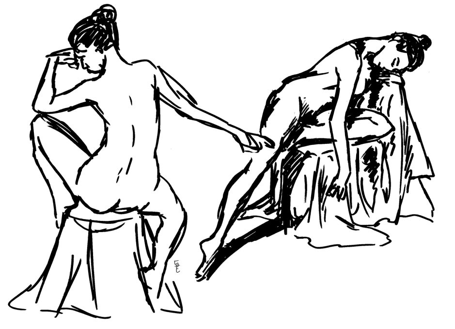 Diese Woche habe ich wieder an den Basics gearbeitet. Nachdem meine Arme so unter Inktober gelitten haben, hatte ich das Gefühl, mich noch mal von Grund auf warm zeichnen zu müssen. Diesmal habe ich das Video No. 394 von Croquis Cafe als Grundlage verwendet. In diesem werden Posen für 15, 30 und 45 Sekunden und dann für 1, 2 und 5 Minuten angezeigt, sodass man sich zunächst erst einmal nur auf die Silhouette konzentrieren muss.
