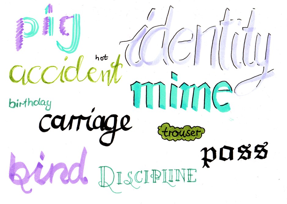 Man könnte glauben, dass jemand, der zeichnen kann auch Typographie beherrscht. Aber lasst euch hier nicht vom Äußeren täuschen! Das ist eine ganze Kunst für sich und ich brauch hier definitiv mehr Übung. Wörter aus einem random word generator.