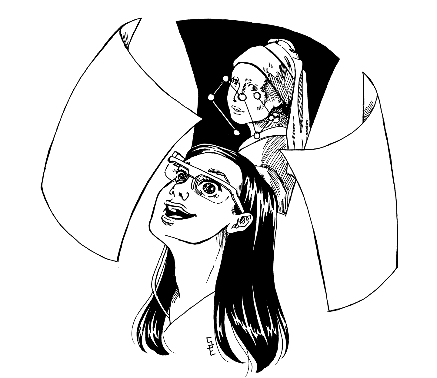 Bevor ich mit 30 ways to fill a sketchbook weitermache, möchte ich eine kleine Zeichnung mit euch teilen, die ihren Weg in meine Doktorarbeit über Augenbewegungen bei ästhetischen Entscheidungen gefunden hat. Ich habe sie am Montag endlich eingereicht. Die Figur in der Mitte trägt einen mobilen Eye-Tracker (Den ich nicht benutzt habe. Wir haben einen stationären Tisch-Eye-Tracker). Im Hintergrund seht ihr Johannes Vermeer`s „Das Mädchen mit dem Perlenohrgehänge“. Als kleiner Disclaimer: Das Gemälde habe ich in de Arbeit nicht benutzt und die Augenbewegungen basieren nicht auf tatsächlichen Daten. Ich mag das Gemälde nur sehr gern. 😉