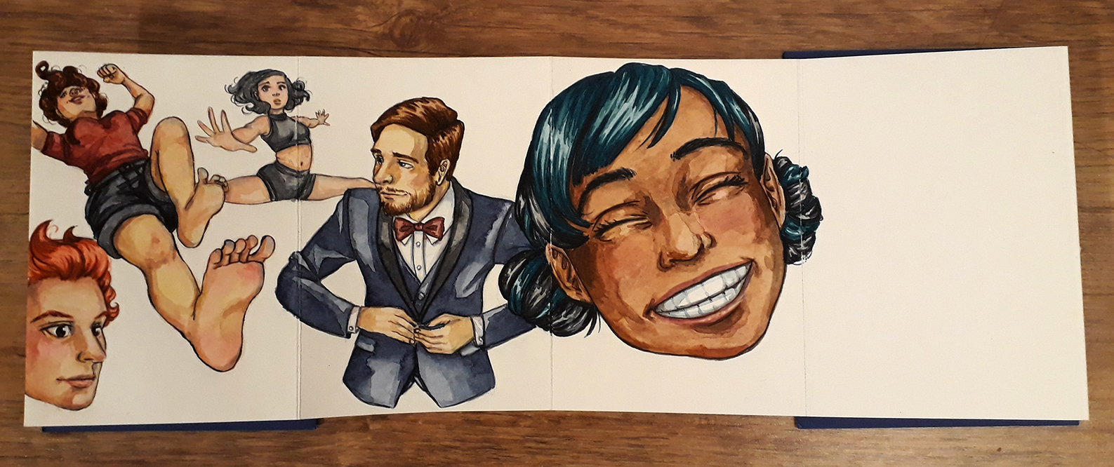 Drawing smiles like these never comes easy to me but I love how she is being through the page. One of my favorites in the Leoprello. Here you can look at all leporello pages.