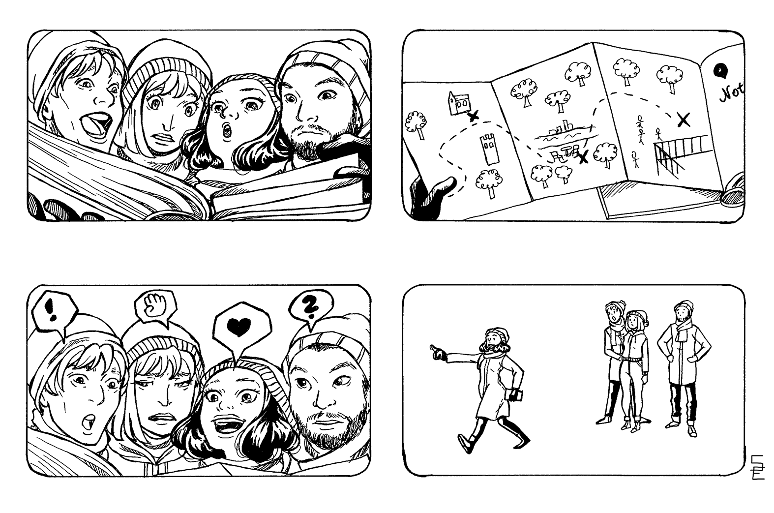 So, the treasure hunt starts! What do you think they will find? You can see all post with panels under the tag The BookMiniComic (a page with all panels in the row in the menu will follow soon).