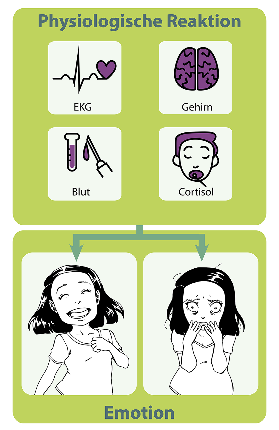 Physiological reactions do not represent an emotion unambiguously. In other words, sometimes different emotions go hand in hand with the same responses from our bodies. An illustration for the topic for Dr. Barbara Schmidt’s book “Angst? Frag doch einfach!” (Anxious? Just ask!). The background color is orange in the book version.