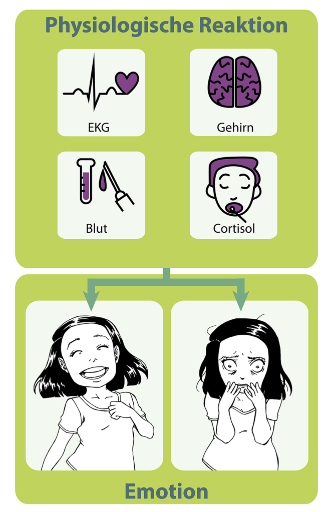 Physiologische Ereignisse können nicht eindeutig einer Emotion zugeordnet werden. Mit anderen Worten: Unterschiedliche Gefühle können mit denselben körperlichen Reaktionen einhergehen. Eine Illustration für das Buch „Angst? Frag doch einfach!“ von Dr. Barbara Schmidt. Im Buch mit oranger Hintergrundfarbe.