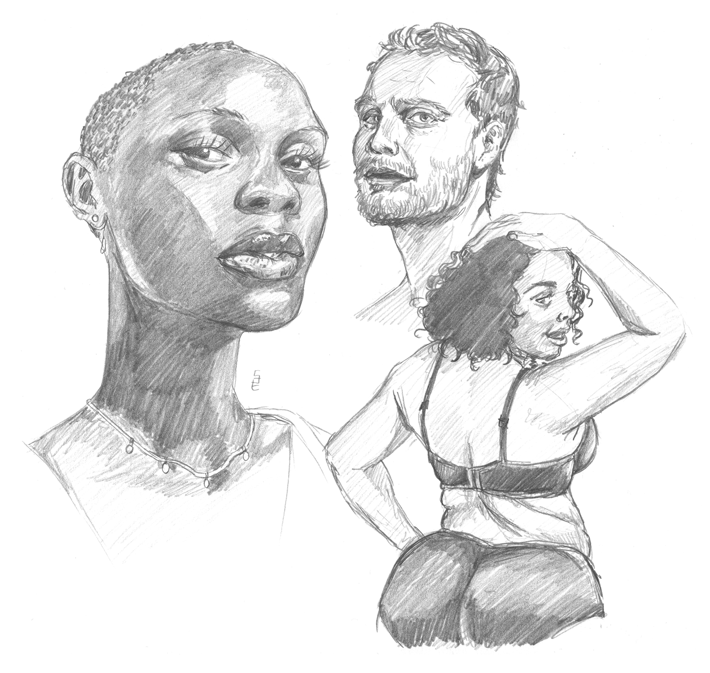 Ich habe mich mal wieder an ein Back to the Basics gemacht. Dieses Mal wieder ein paar Bleistiftzeichnungen, die auf Fotos von Männern und Frauen basieren, um ein wenig Anatomie zu üben. Mit dem Mann bin ich nicht ganz so zufrieden, aber das Gesicht ganz links mag ich sehr. Referenzen sind Foto 1, Foto 2 und Foto 3.